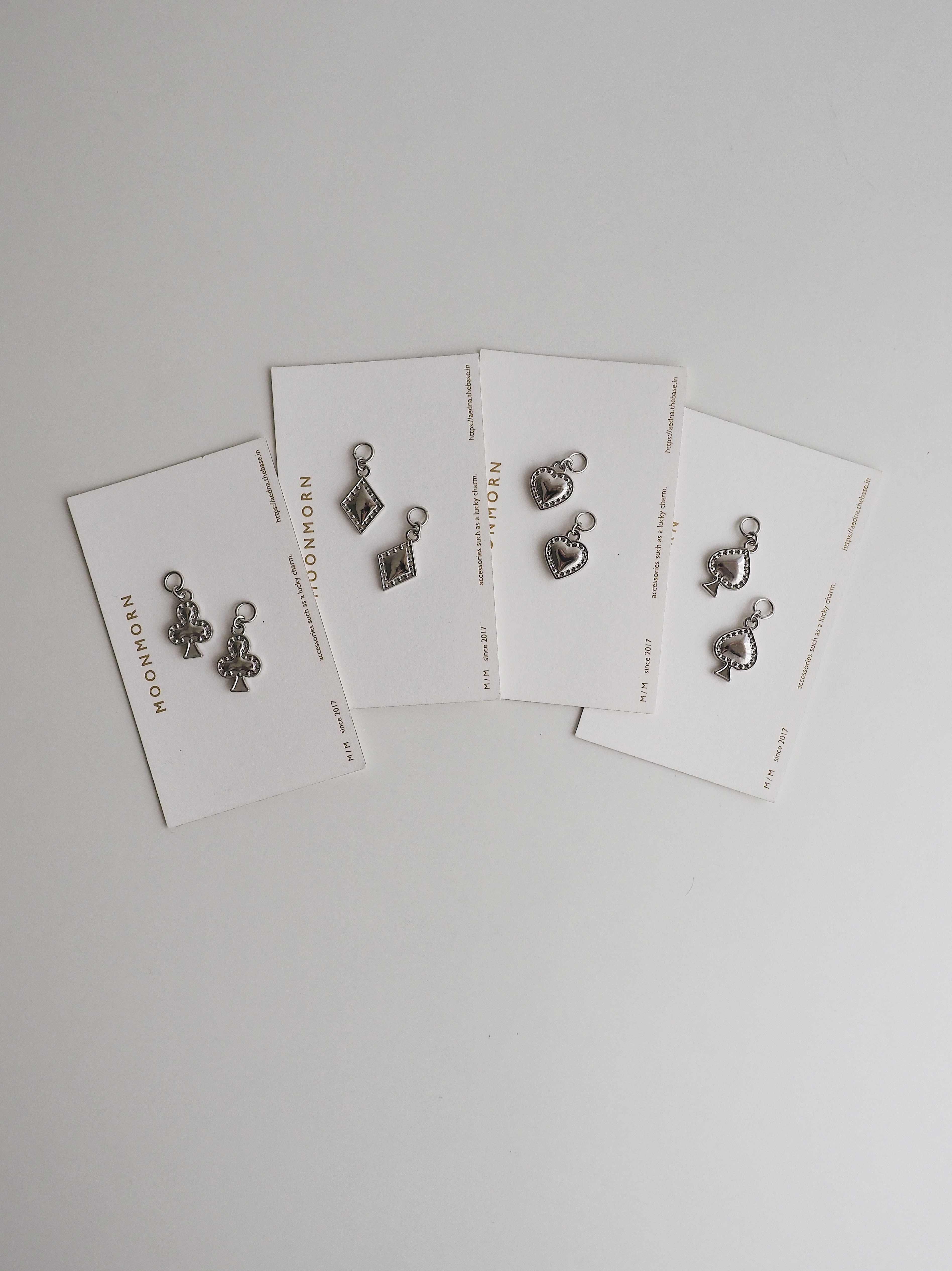 トランプの柄チャームとクリアガラスのビーズリングの2wayでお楽しみいただける耳飾りのセットです。